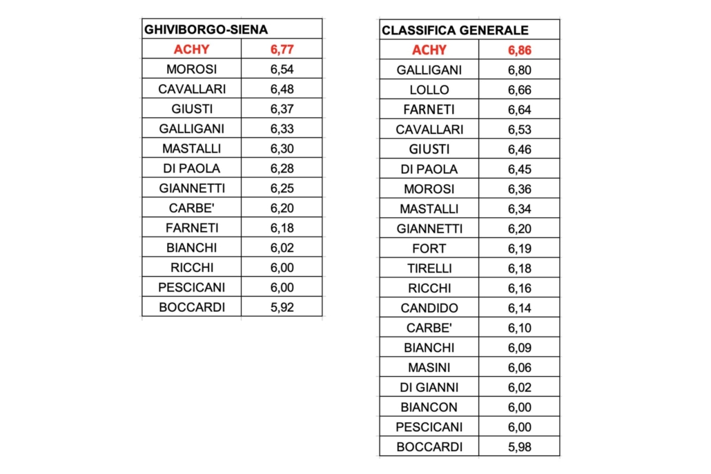 In Ghiviborgo-Siena ottima prova della difesa. Achy. Morosi, Cavallari e Giusti nelle prime quattro posizioni. In classifica generale e Emanuel Achy a compiere un grande balzo in avanti collocandosi in vetta della graduatoria.