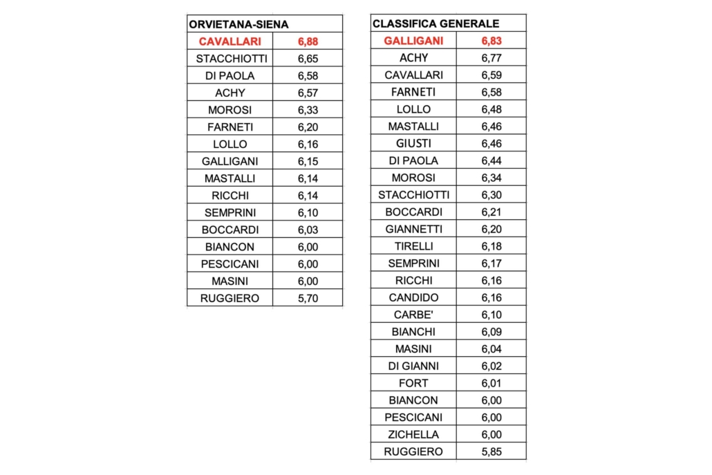 La prestazione contro l’Orvietana, sotto tono per come siamo abituati, ha permesso alla difesa di raccogliere le valutazioni più alte. Cavallari, Stacchiotti, Di Paola, Achy e Morosi occupano nell’ordine le prime cinque posiazioni. Non cambia molto la classifica generale che vede ancora Galligani al primo posto, tallonato da Achy e Cavallari.