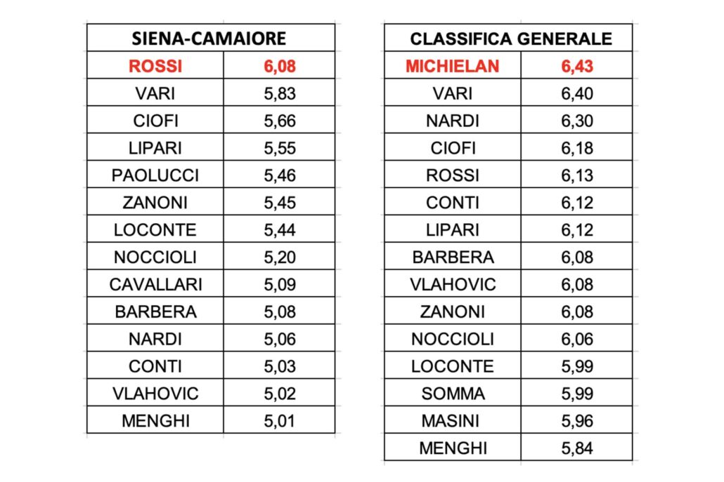 Un ‘altra partita in ombra per i ragazzi di Bellazzini, si salva solo Rossi, per tutti gli altri solo insufficienze. Si abbassa ovviamente la media della classifica generale che vede in testa Michielan seguito da Vari, Nardi e Ciofi.
