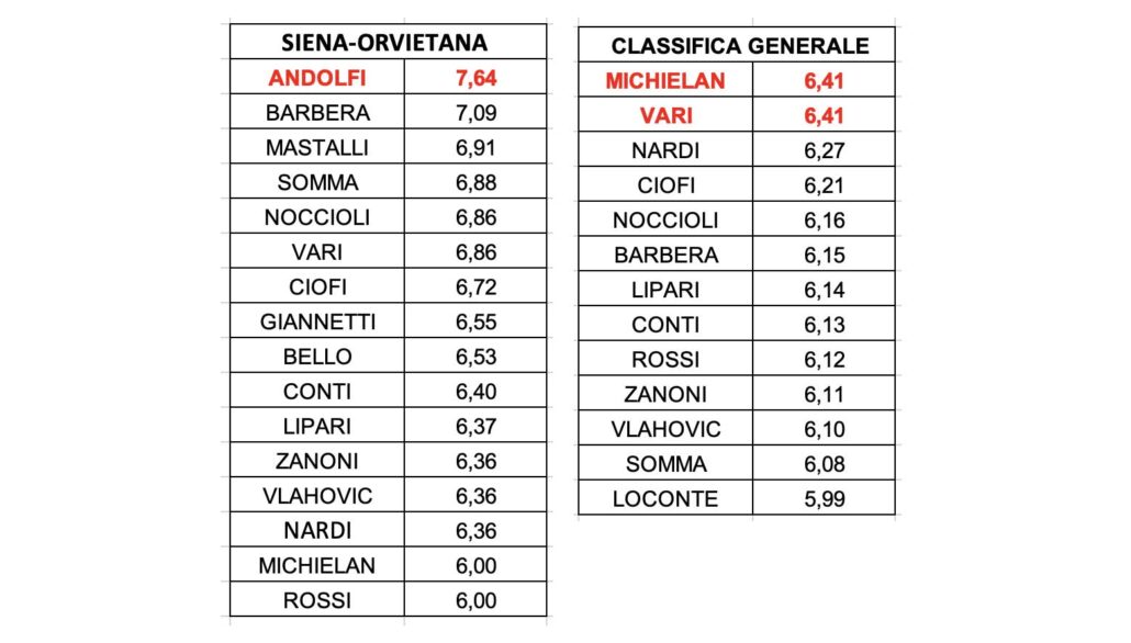 Grande partita della Robur che si afferma con un largo punteggio con l’Orvietana. Ottima prestazione di tutta la squadra con note di merito per Andolfi autore di una doppietta, Barbera, Mastalli, Vari e Noccioli. In classifica generale una coppia al primo posto: Michielan e Vari. Media generale in netta ripresa per tutti.