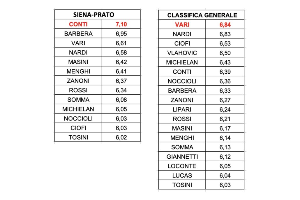 Una partita particolarmente delicata in cui il Siena ha ancora una volta dimostrato la sua compattezza e la sua grande determinazione. E’ finita 0-0, ma se c’è una squadra che si morde le mani è sicuramente quella bianconera. Grande partita di Conti e Barbera, ma Vari, Nardi e Masini non sono da meno. In classifica generale cambio al vertice con Vari che scalza, seppur di un solo centesimo di punto, Nardi. Dietro ai due, staccati di pochissime frazioni di punto, Ciofi, Vlahovic e Michielan. Salgono Conti e Barbera, tutti gli altri mantengono la posizione fin qui occupata. Da questa giornata entreranno in classifica solo quei giocatori che hanno disputato almeno la metà delle gare giocate e hanno ottenuto una valutazione da parte delle testate che formulano le pagelle e dal nostro sondaggio tra i tifosi.