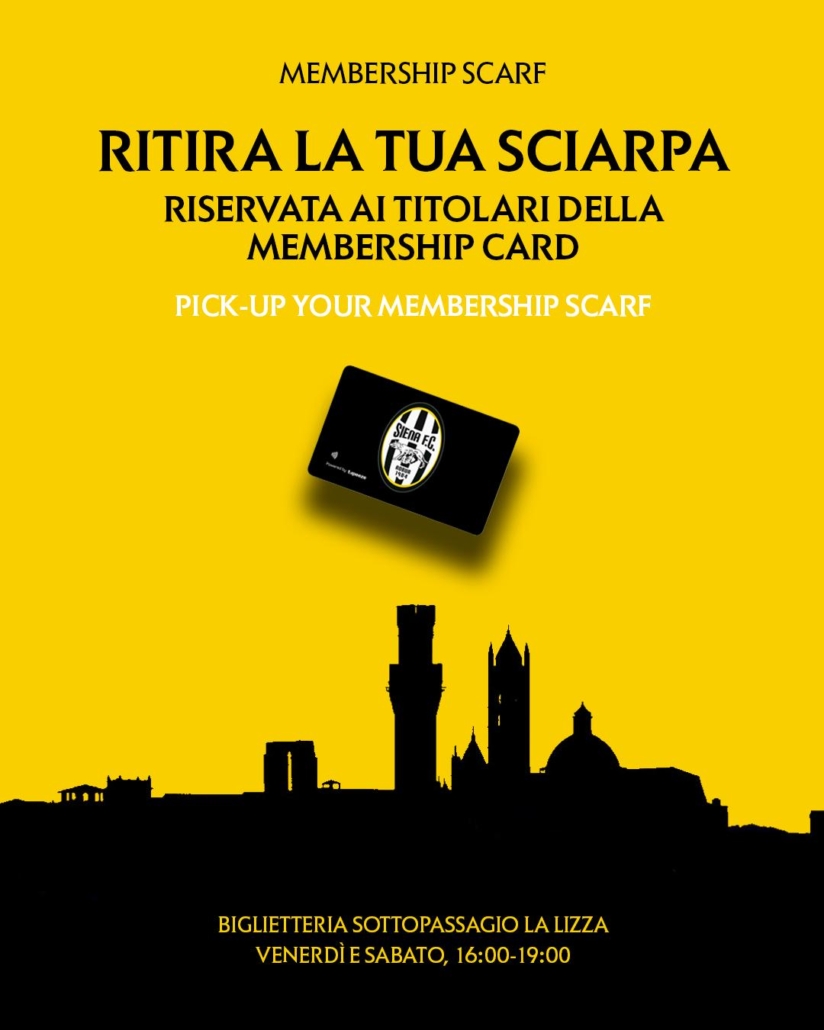 È arrivata la sciarpa esclusiva della Robur riservata esclusivamente ai possessori della Membership Card. Si può ritirare oggi e domani dalle 16 alle 19 alla biglietteria del sottopassaggio La Lizza, che sarà aperta anche per la consegna degli abbonamenti e la vendita dei biglietti di Orvietana-Siena (che non si possono acquistare direttamente allo stadio). Chi non può prendere la sciarpa in questi due giorni lo potrà fare durante le partite casalinghe, quando saranno allestiti dei punti di ritiro.