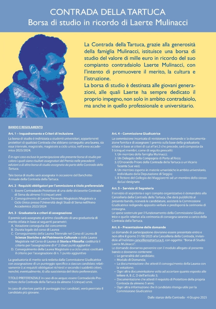 La Contrada della Tartuca, grazie alla generosità della famiglia Mulinacci, istituisce una borsa di studio del valore di mille euro in ricordo del suo compianto contradaiolo Laerte Mulinacci, con l’intento di promuovere il merito, la cultura e l’istruzione. La borsa di studio è destinata alle giovani generazioni, alle quali Laerte ha sempre dedicato il proprio impegno, non solo in ambito contradaiolo, ma anche in quello professionale e universitario.