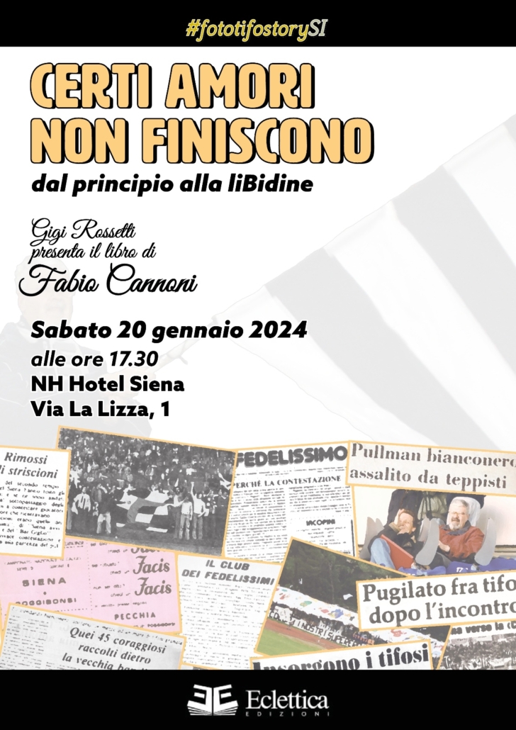 Questa sera alle ore 17.30 presso la sala dell’NH Hotel di Siena, Via La Lizza 1, si terrà, con la conduzione di Gigi Rossetti, la presentazione del libro di Fabio Cannoni, edito da Eclettica Edizioni, dal titolo “Certi amori non finiscono”.