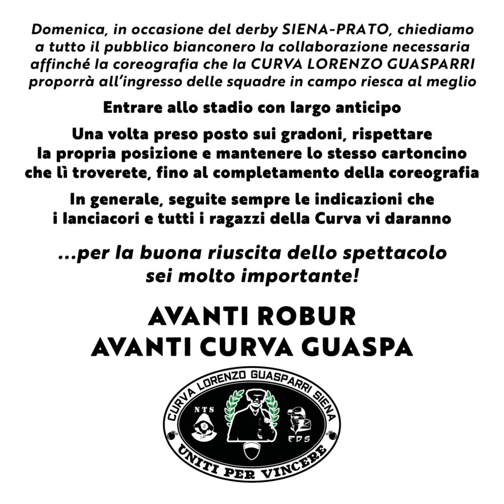 Domenica, in occasione del derby SIENA-PRATO, chiediamo a tutto il pubblico bianconero la collaborazione necessaria affinché la coreografia che la CURVA LORENZO GUASPARRI proporrà all’ingresso delle squadre in campo riesca al meglio