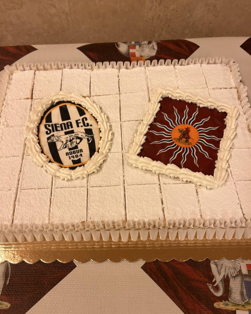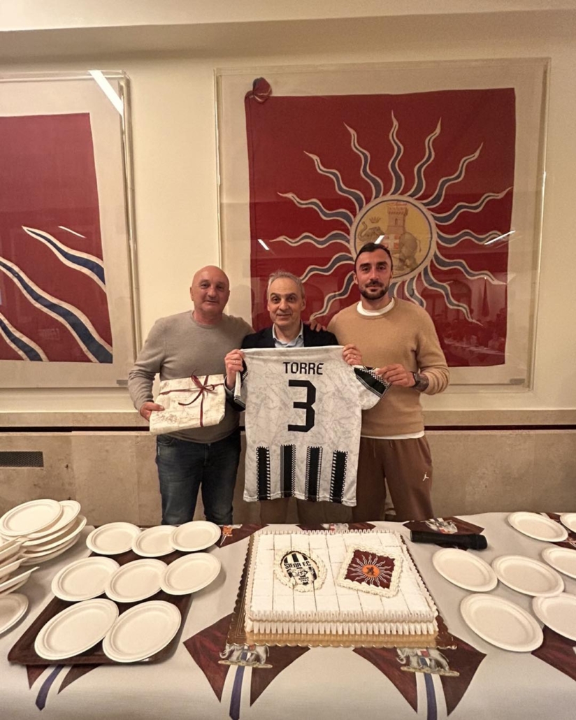 Proseguendo il giro delle Contrade, ieri sera il Siena è stato ospite della Torre. La delegazione bianconera era composta da Conte, Levorato, Magrini, Barbieri, Pascolini, Targi e dai giocatori Farneti, Di Paola, Candido, Masini, Hagbe e il capitano Tommaso Bianchi.