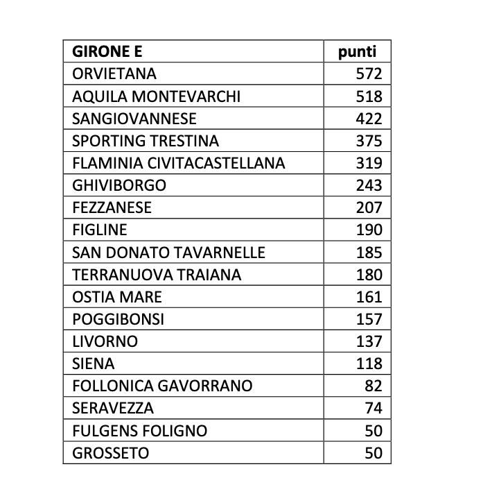 È l’Orvietana probabilmente la vera sorpresa del campionato. Entrati all’ultimo nei playoff a scapito di Siena e Grosseto, gli umbri non solo si sono arrampicati fino alla finale, perdendo col Seravezza, ma sono anche la squadra che ha puntato di più sui giovani, piazzandosi al primo posto nella classifica “Giovani D Valore”. L’Orvietana riceverà così un premio di 50.000 euro. Sul podio Montevarchi (che ottiene 30.000 euro) e Trestina (20.000 euro), le quali entrano per un soffio in questa speciale graduatoria, che ricordiamo non prende in considerazione i club retrocessi. Al quarto posto la Flaminia (10.000 euro), al quinto e ultimo il Ghiviborgo (5.000 euro).