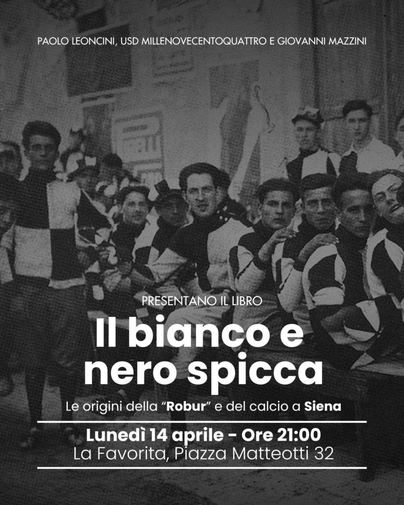Il giorno 14 aprile alle ore 21 USD Millenovecentoquattro ed il professor Giovanni Mazzini presentano il libro “Il bianco nero spicca. Le origini della ‘Robur’ e del calcio a Siena” di Paolo Leoncini, edito