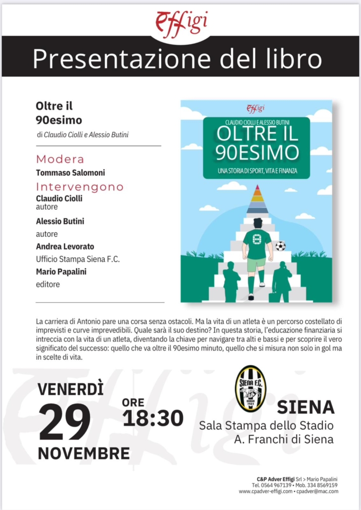 L’educazione finanziaria che si intreccia con la vita di un atleta, diventando la chiave per navigare tra alti e bassi e per scoprire il vero significato del successo: quello che va oltre il 90esimo minuto, quello che si misura non solo in gol ma in scelte di vita. Questo il fil rouge di “Oltre il 90esimo. Una storia di sport, vita e finanza”, il libro scritto da Claudio Ciolli e Alessio Butini, che sarà presentato a Siena, venerdì 29 novembre alle ore 18:30, nella sala stampa “Renzo Corsi” dello stadio Artemio Franchi. La storia di una giovane promessa del calcio italiano, Antonio Crestelli (nome di fantasia), è la narrazione di un percorso che molti atleti e molti professionisti in generale si trovano ad affrontare. «Antonio è il classico esempio di quanto sia importante imboccare il giusto bivio nel momento delle scelte che la vita ci propone – affermano i due autori del libro Ciolli e Butini -. Il momento delle scelte necessita però di un giusto supporto, di una guida che sia in grado di presentare gli strumenti che possono fare la differenza. La nostra speranza è che la storia di Antonio possa rappresentare un modello di gestione nell’ambito dell’educazione finanziaria, in modo che si possa comprendere l’importanza di essere proiettati verso una solida costruzione del futuro finanziario». La presentazione del libro vedrà un’introduzione da parte di Andrea Levorato, addetto stampa del Siena FC, e la moderazione da parte del giornalista Tommaso Salomoni. Claudio Ciolli (classe 1984) ed Alessio Butini (classe 1993) sono consulenti finanziari presso SANPAOLO INVEST, divisione private del gruppo Intesa Sanpaolo. Dal 2020 si sono specializzati in consulenza finanziaria per sportivi. I due hanno il calcio nel sangue. Alessio, che ha trascorsi calcistici professionistici (settore giovanile del Siena, due anni di Serie C), ha ricoperto il ruolo di segretario generale del Siena Calcio prima di iniziare l’attuale percorso professionale. Claudio ha un passato da calciatore dilettante ed allena una squadra giovanile nella provincia di Grosseto (per lui il calcio è una questione di famiglia, con padre e fratello ex calciatori professionisti).