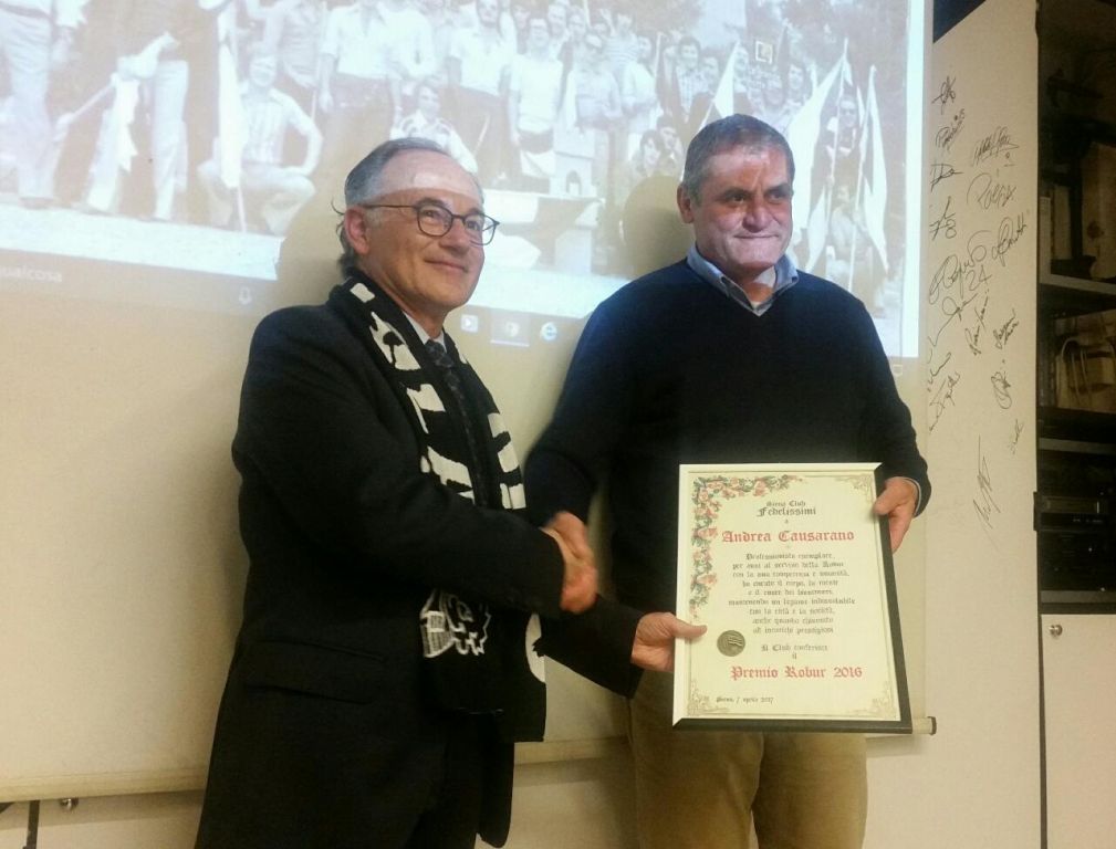 Pezzi grossi della storia bianconera si sono riuniti ieri sera per festeggiare il Premio Robur 2016, il dottor Andrea Causarano. Accanto al doc, tre bandiere della Robur, Stefano Argilli, Michele Mignani e Gill Voria, e anche Giuliano Gepponi e Stefano Osti. E poi il grande condottiero della cavalcata verso la serie A, Giuseppe Papadopulo. Un ritorno, il suo, che ha emozionato tutti, tanto forte è, ancora, il legame tra il mister e Siena. Emozionante anche rivivere al maxi schermo i momenti più belli di quegli anni – a partire dalla notte di Genova – nel video curato da Nicola Natili, e negli aneddoti raccontati dalla voce dei protagonisti. “Una volta decidemmo di andare in ritiro in una località sperduta della pianura Padana – ha ricordato Causarano -, o non era il luogo dove Vasco Rossi stava preparando un suo concerto? Papadopulo si presentò e Rossi, stringendogli la mano gli disse ‘Papa chi’? E il mister tutto d’un pezzo se ne andò…”. E’ scorsa così la serata, a cavallo della storia. “Dietro a una squadra di calcio, a chi scende in campo, ci sono tanti protagonisti, che agiscono lontano dai riflettori, ma il cui operato è fondamentale – ha detto il giornalista Orlando Pacchiani introducendo il Premio Robur 2016 – e uno non vale l’altro: Andrea Causarano ha accompagnato la Robur dalla serie C alla serie A. Al di là delle indiscutibili qualità mediche, ha sempre saputo dosare pazienza e diplomazia, senza mai accontentarsi, cercando di operare al meglio anche nelle situazioni più critiche, in mancanza di infrastrutture. E sì che il suo lavoro era fondamentale, far girare a 1000 i giocatori. Alla Juventus ci arrivi soltanto se sei al vertice della professione e dai le massime garanzie, perché hai tra le mani uomini da milioni di euro. Non poteva andare a persona migliore questo riconoscimento dei Fedelissimi, a maggior ragione perché Andrea è un figlio di Siena, del Costone e della Selva”. “Beh… – ha sorriso Andrea Causarano -, mi sento quasi a disagio a ricevere il premio davanti a tanti protagonisti della storia bianconera… A Torino ho vissuto momenti indimenticabili, ma la notte di Genova rimane la medaglia d’oro delle mie soddisfazioni sportive, anche se ho fatto una finale di Champions… La Robur è la squadra che mi ha permesso di arrivare tanto lontano, di realizzare un sogno che non avrei neanche immaginato di mettere nel cassetto, ma è anche e soprattutto la ‘mia’ squadra: da Baldini a Beretta, con cui ho vissuto la resa finale, è stato tutto un turbinio di emozioni. Per arrivare alla Juventus sono partito da Torre del Greco, la mia prima trasferta, dove ho conosciuto i ‘famosi’ Gommone e Il Sordo, tanto per dire… In mezzo sapete tutti cosa c’è stato. Ho stretto tanti rapporti, e quello con mister Papadopulo è sempre stato speciale. Come con i ragazzi seduti a questo tavolo, che hanno cuciti addosso i colori bianconeri e sono diventati anche loro, figli di Siena. E tra loro metto anche Vergassola e Radice”. (Angela Gorellini)
