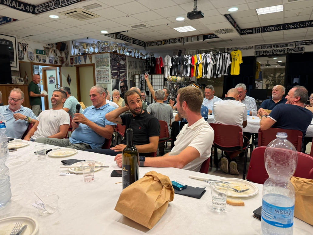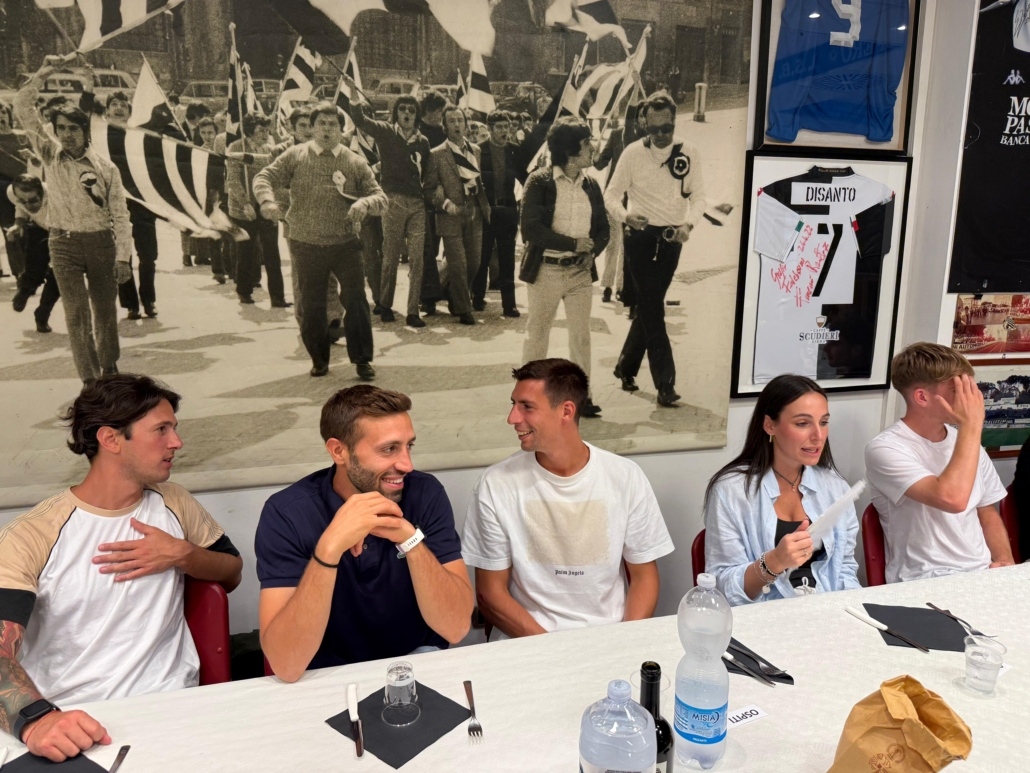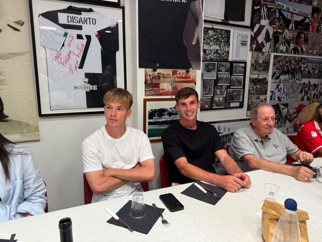 Serata all’insegna della spensieratezza quella che si è svolta ieri al Siena Club Fedelissimi, dove mister Tommaso Bellazzini, accompagnato dal suo staff, composto dal vice Nico Lelli, dal preparatore atletico Gianmaria Bernini e dal match analyst Giacomo Cioni, e da una rappresentanza della squadra (i calciatori Cavallari, Menghi e Vlahovic), ha visitato i locali del club e si è intrattenuto a cena. Presenti anche il segretario e team manager Luigi Conte e l’addetta stampa Giulia Milanesi.